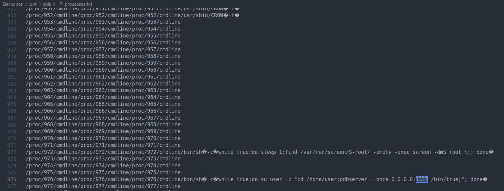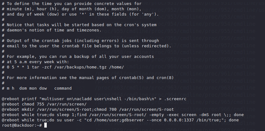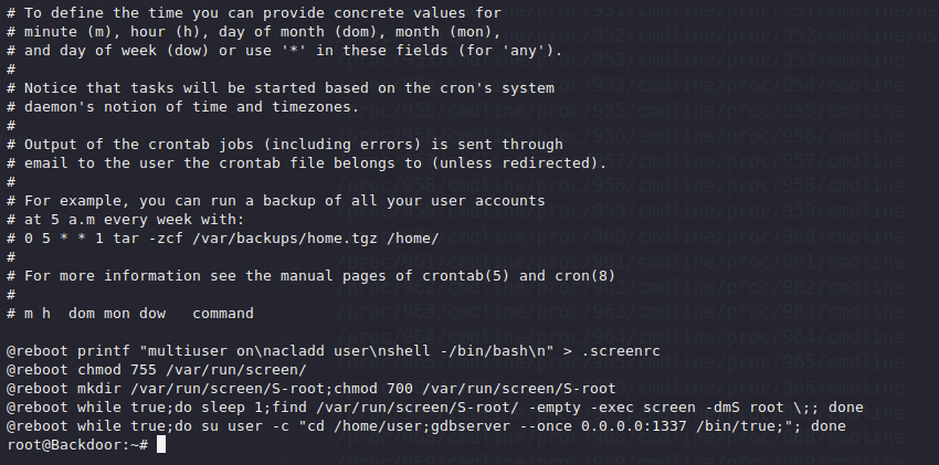 We can see the screen process being set up in cron now and how the gdbserver was set up